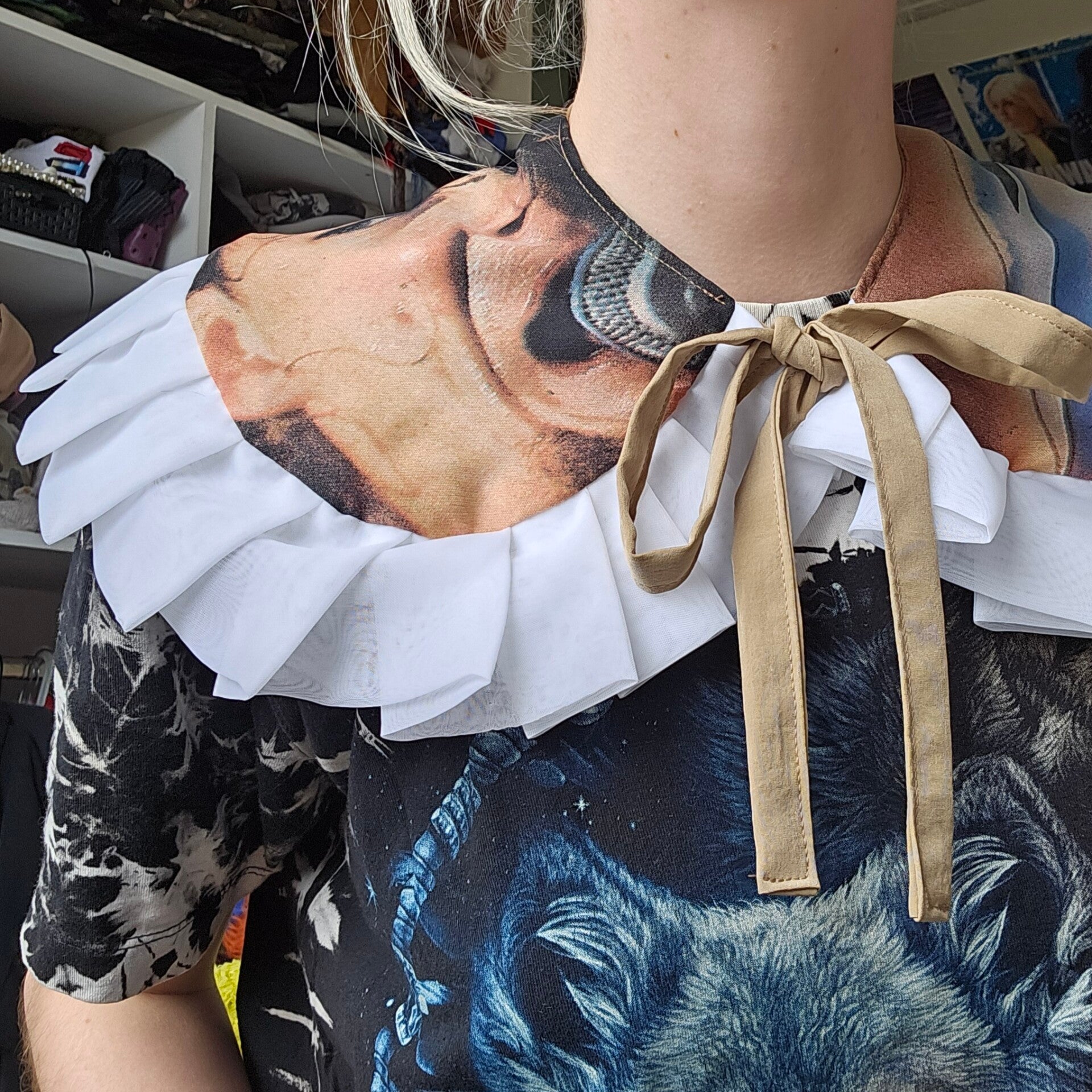 Lined with a vintage smooth brown fabric, handfolded ruffles on the edge and handmade strings to tie your collar with a bow. Made with 100% secondhand materials!