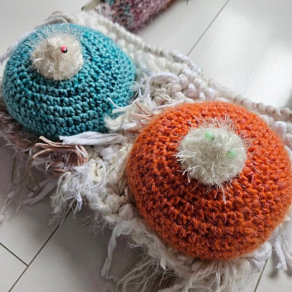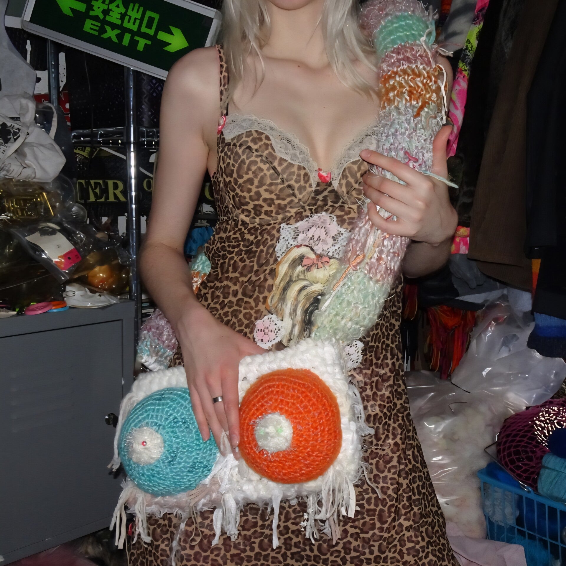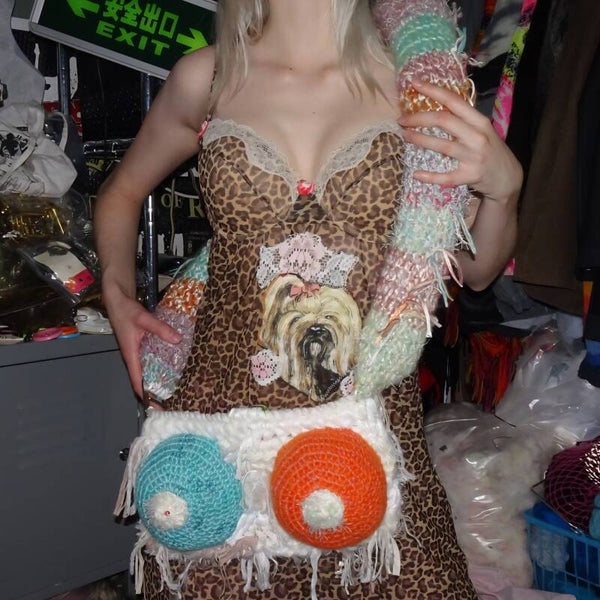 A real Punk Princess CLASSIC! One with meaning and with a message! Each bag is one of a kind with one of a kind boobs. Literally, I don't have a written pattern for the boops, they just become the way they want! It's handmade with 100% secondhand materials! The buckle on the beginning of the handle is very useful for adding bagchains and charms and stuff! It also has 1 big clip in the middle of the opening to keep the bag closed!