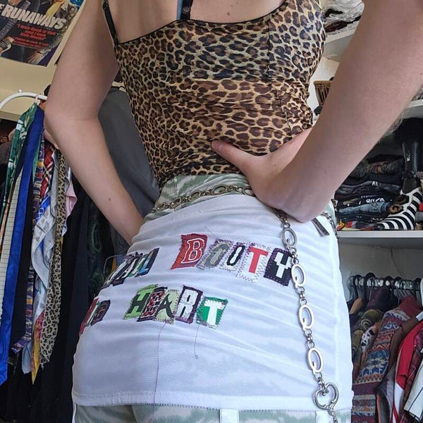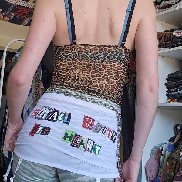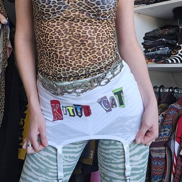 A vintage lingerie piece with reused letters on it! Great for layering over pants and skirts!