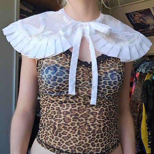 Cute statement collar with a white lace design that has a super cute scene of swans on it! Made from a very unique vintage lace curtain that I got secondhand!