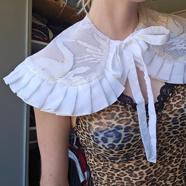 Lined with a white mesh fabric, handfolded ruffles on the edge and handmade strings to tie your collar. Made with 100% secondhand materials!