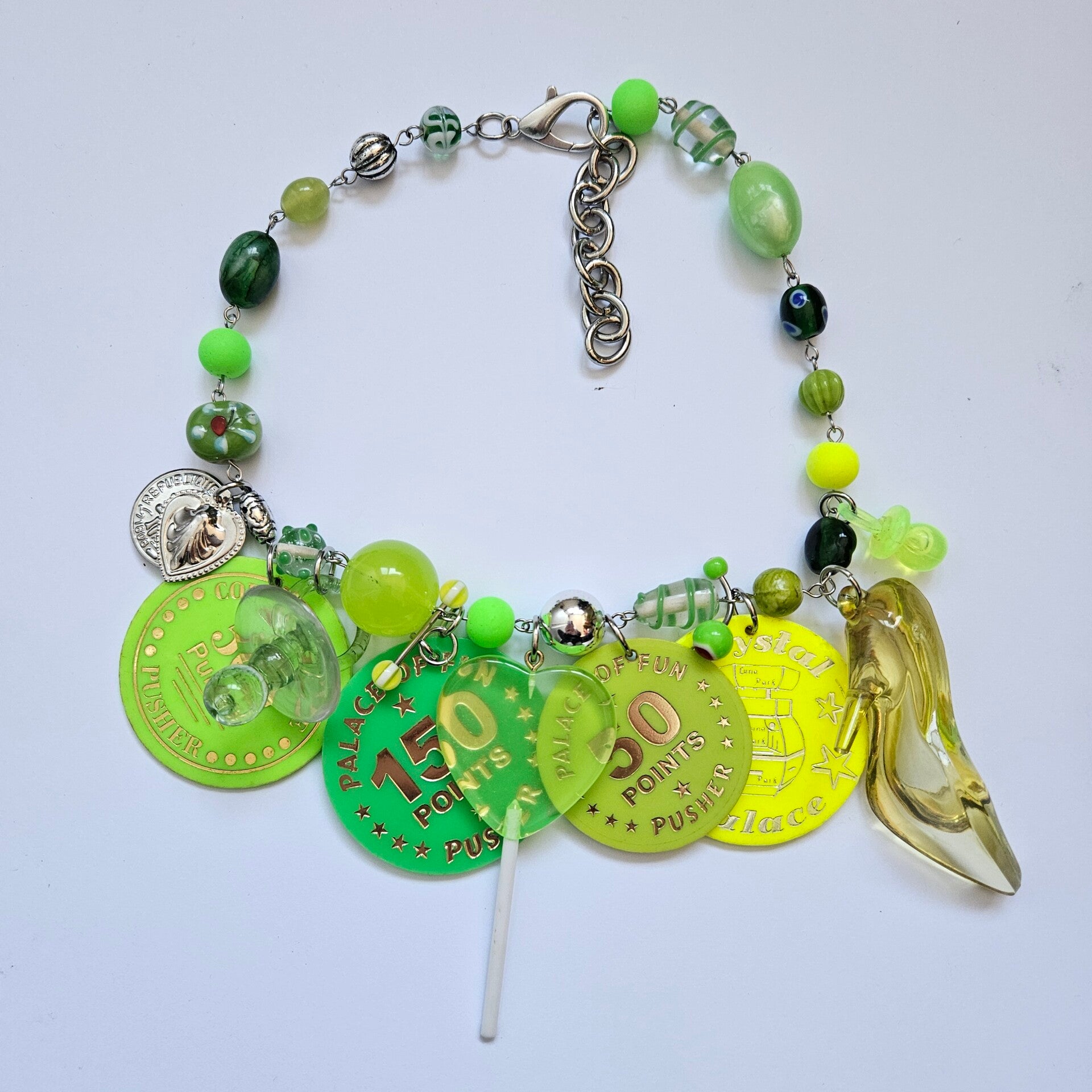 This necklace is made from secondhand beads, charms and other materials. I take apart jewelry from thriftstores and turn them into new pieces of art.