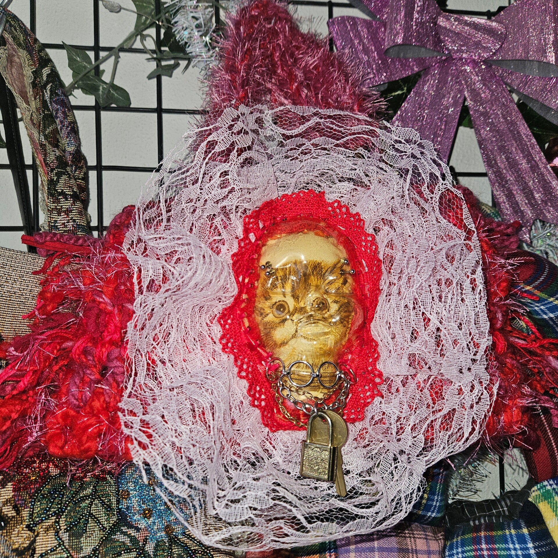 A small series of Spirit Animal Dollbags! Made with secondhand yarns, handpleaded vintage lace ruffles, bows, piercings, different kinds of hardware, vintage animal print fabric and a really cute but creepy see-trough dollhead! Together they make a really cute bag <3